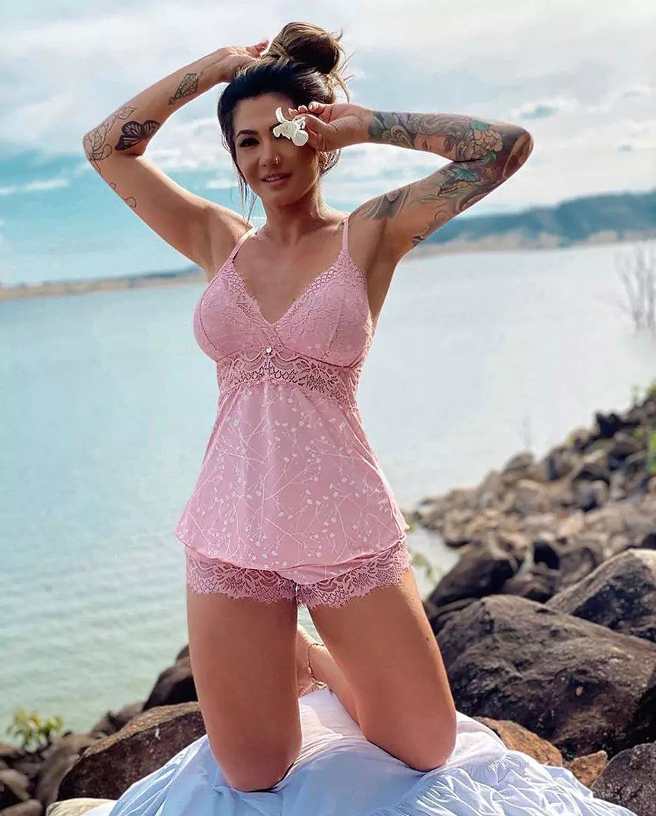 Short doll confeccionado em tecido leve e extremamente fresco, com detalhes em renda exclusiva, ideal para garantir uma noite de sono tranquila com muito estilo. Composição do tecido: 86% poliamida e 14% elastano. Acessórios banhados a ouro 24k. Durma linda e desperte ainda mais maravilhosa todos os dias.